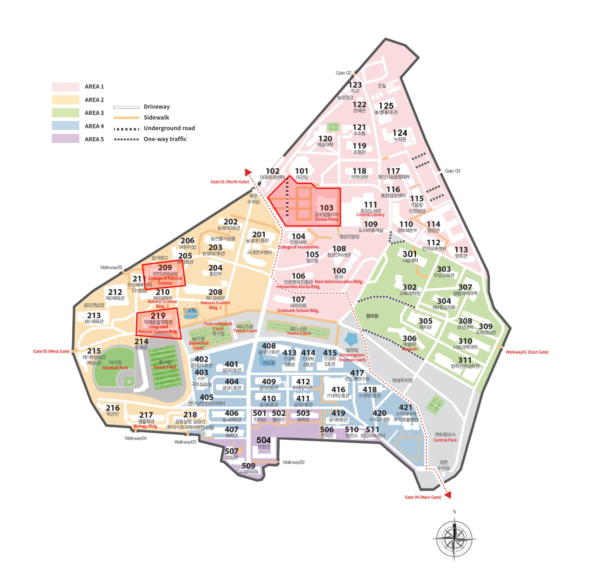 The areas highlighted in RED are the venues for the conference and meals. All conference sessions will be held in Building 219.